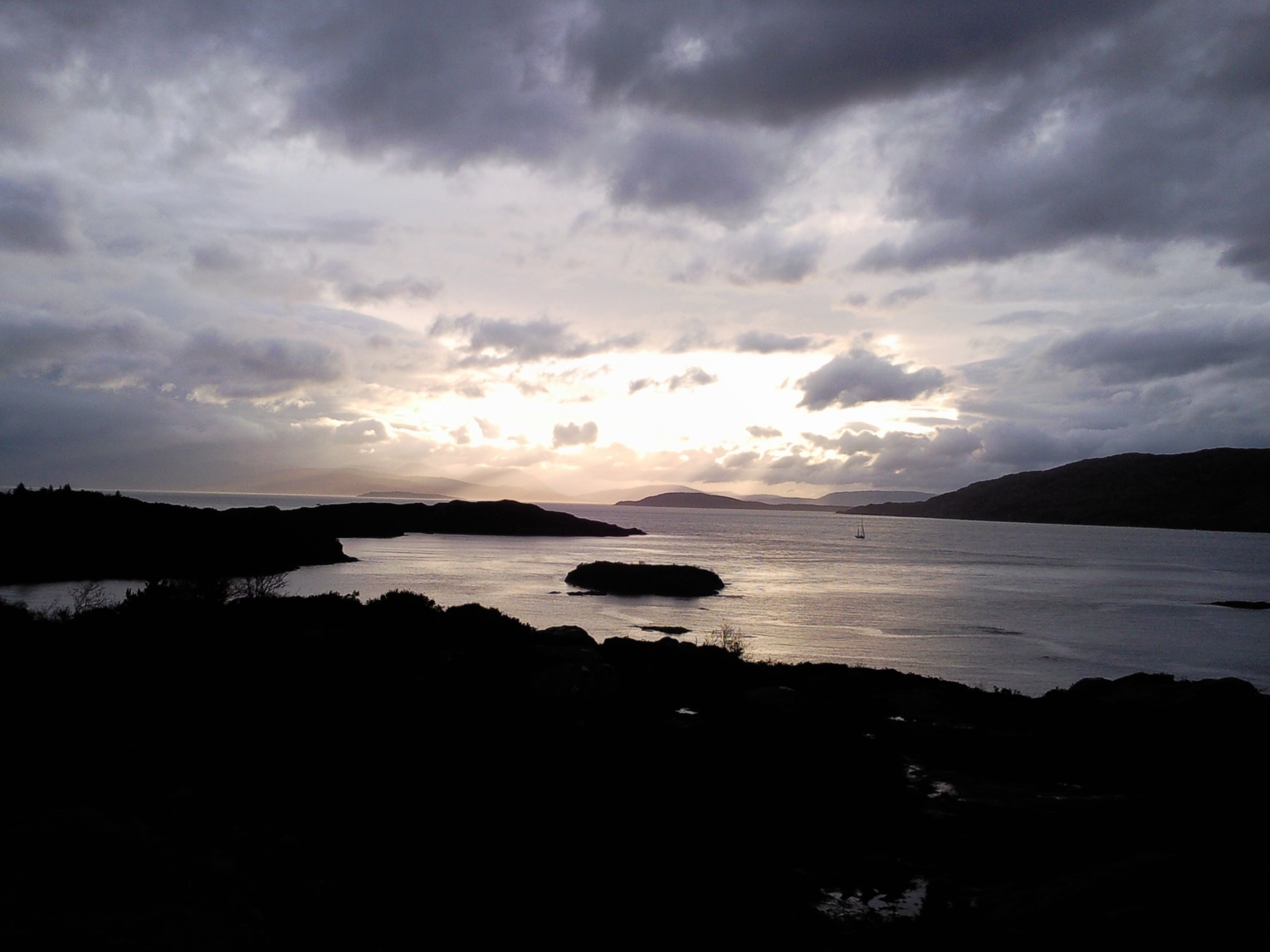 This picture is taken in Plockton, Rosshire, from the hill at the back of our house as the sun sets over the Isle of Skye.