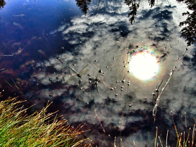 When the sun disappeared behind a cloud the reflections became even more mysterious, and I love the way its dazzling light is diffused through the cloud and then reflected on the water….it becomes almost moon like, and the blue daytime sky darkens, giving a mystical feel to the pool. It was a deeply relaxing and spiritually uplifting experience, and I stayed for hours, despite the midges.