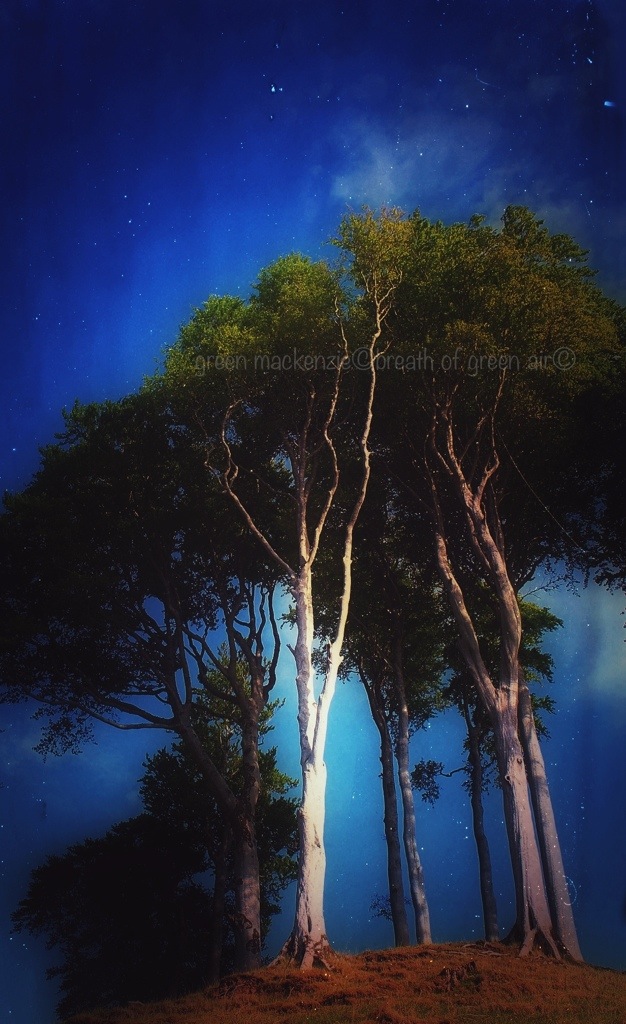 The photo was taken in early evening light, so the sun was low and illuminating the white trunks beautifully, leaving the canopy a bit darker. I processed the photo using a couple of apps to darken the sky and add tiny light leaks which form the stars. Hope that’s not too much cheating!