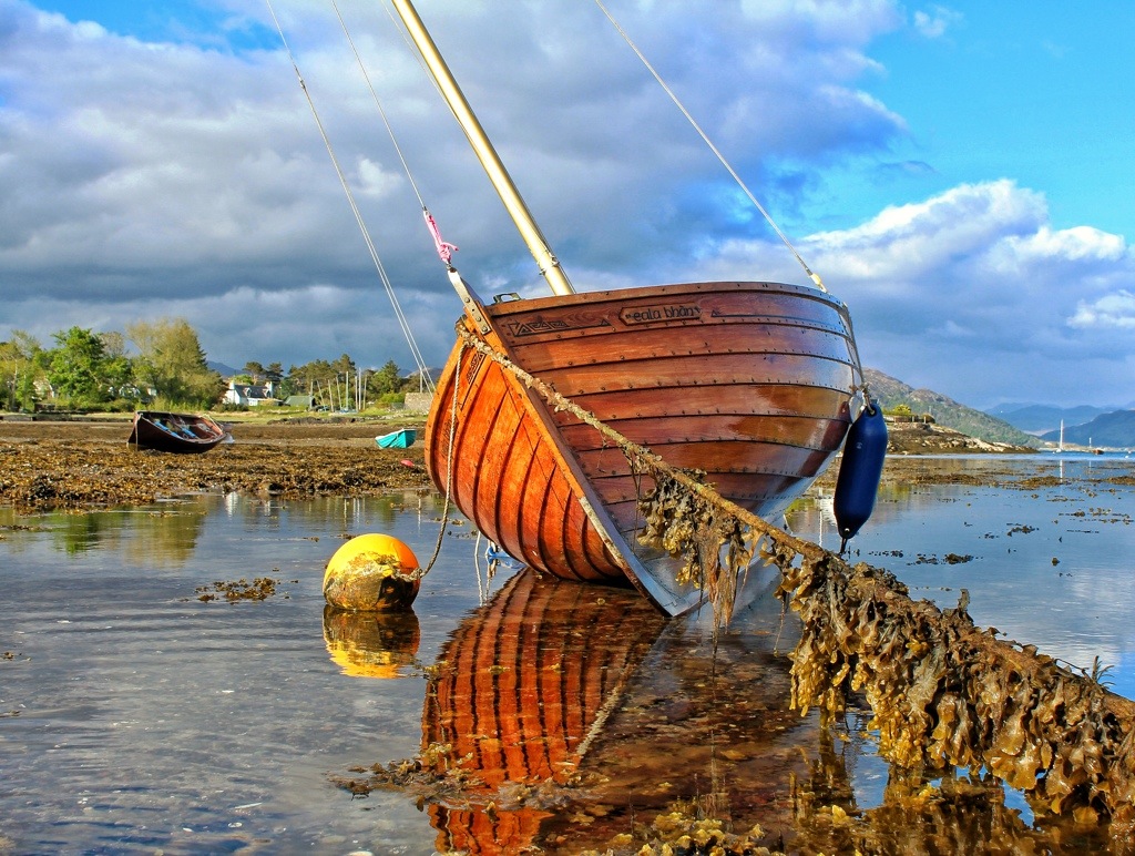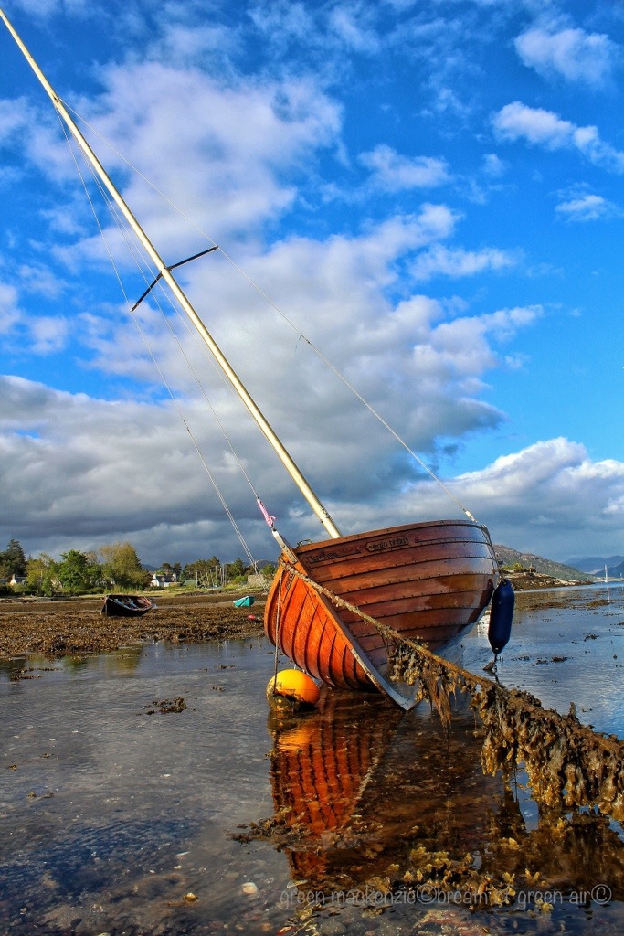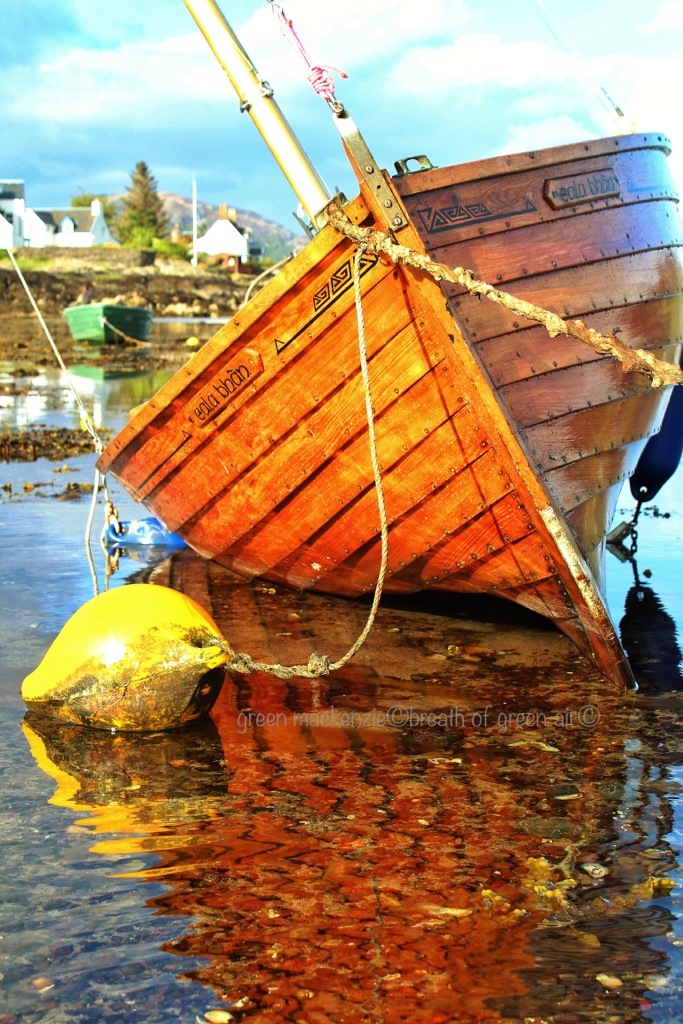 These traditional Plockton boats have been a feature of the foreshore for generations, and many of the boats are over 100 years old. Hand built by a shipwright in Portree on the Isle of Skye, the klinkerbuilt design has been replicated in the newer replacement boats. I have fond memories of sitting curled snugly in the bow as a child, with the wind whipping over my head filling the sails, and the waves lapping the keel beneath my legs. The curves of the boat held me firmly even as the boat tacked and turned in the shifting wind.