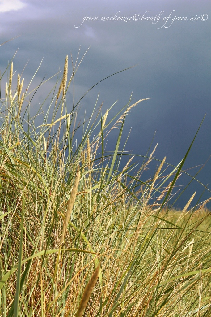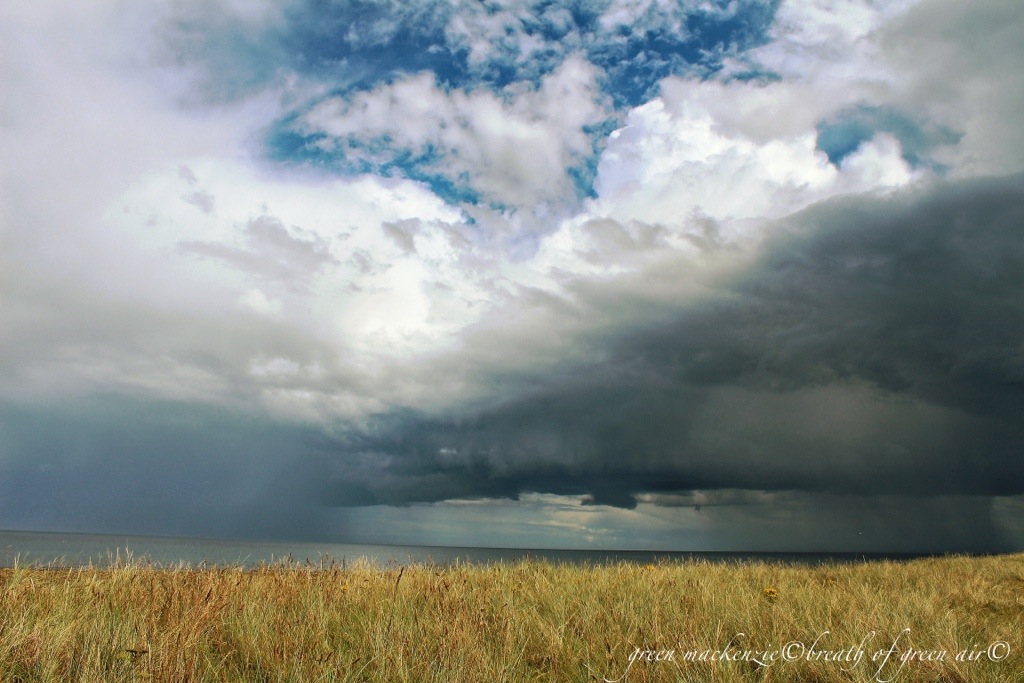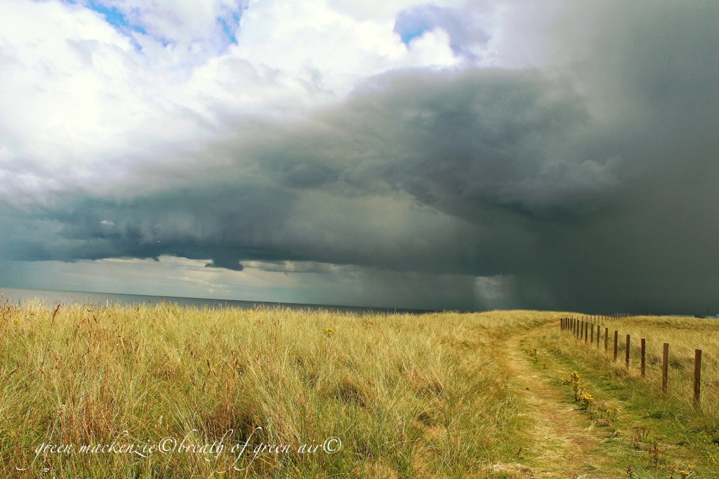 The warm stillness of the day had gathered in my bones, and I felt the urge to walk it out. I needed space, movement and freshness so I headed for the coast. The sky was filled with patches of white clouds and blue sunshine, suspended in a lively breeze, but the breath of this breeze was warm and humid. It gathered on my skin in moist pools as I walked, and the clouds above mirrored this gathering, closing in around the edges of the sky. The further I walked the fuller the sky became, and the day lost it’s breath into the heart of a summer storm.
