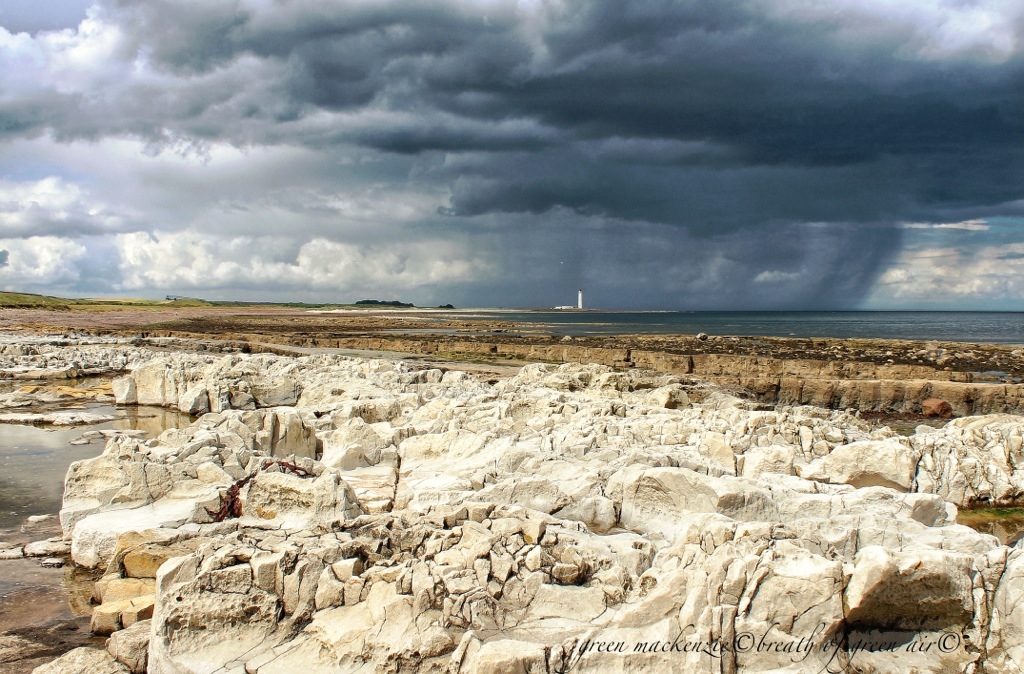 A pool of sunlight clung to me as I walked out along the coast amid thunder and lightning. Rain fell in dark sheets to either side of me, bouncing and filtering the sunlight into beautiful highlights. The white limestone rocks, and the white tower of the lighthouse drew the light.