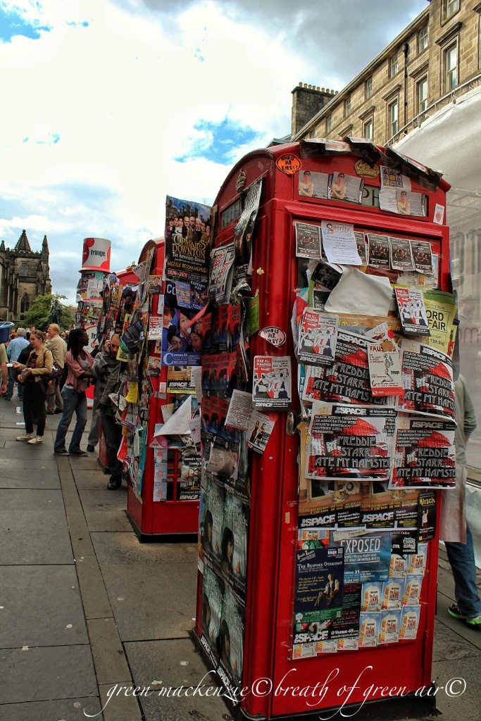 Just in this area of town fly posters are allowed, and even encouraged. All free surfaces get covered in growing layers of adverts vying for your attention. This row of phone boxes are very close to the Fringe Ticket Office, and so they get quickly covered. There’s a feeling that if you stand still too long you might get covered in posters too.