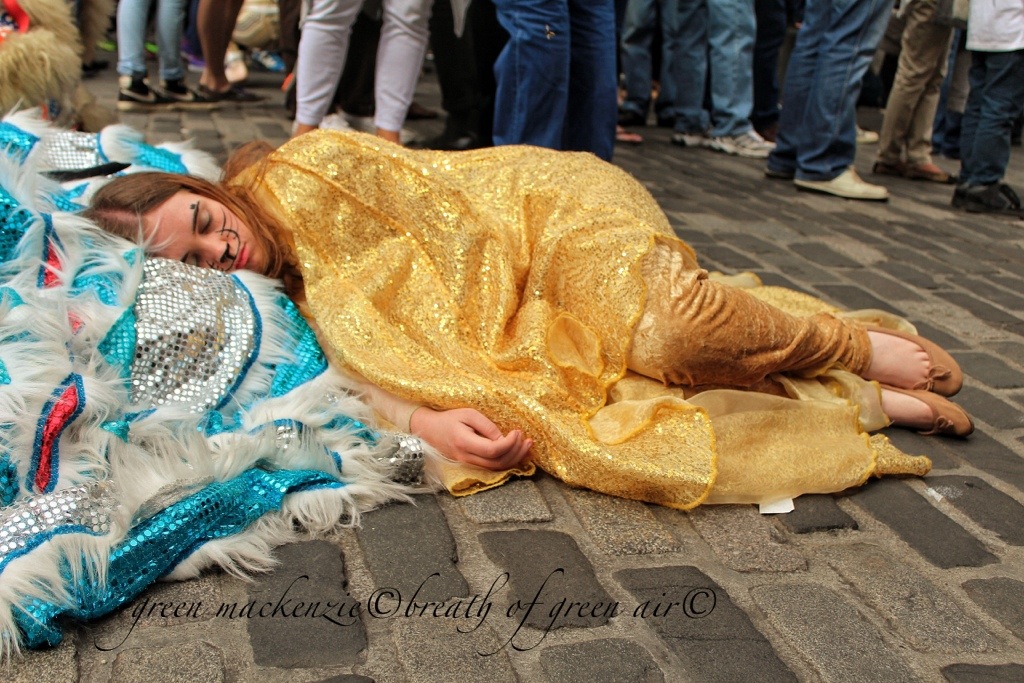I feel a little guilty about this photo, let me explain. I too loved the connected expression on the fairy’s face and so clicked away taking a few shots, when I took my camera away from my eye and moved left slightly I realised the little girl was crying. She had become separated from her parents, and huge tears were rolling down her cheeks as the concerned fairy tried to find out where she had last seen her mum. A second yellow fairy appeared, and I got involved looking for a police officer. Suddenly her big brother appeared, “Hurry up , everyone’s waiting for you”, he announced before leading her off smiling, the tears long forgotten.