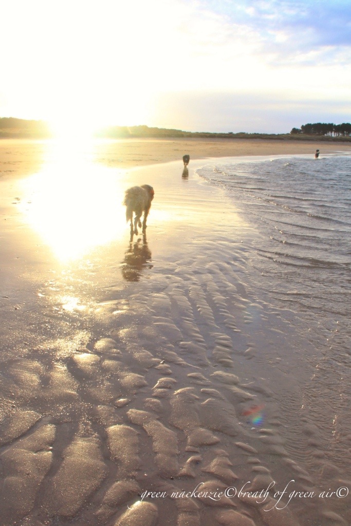 We walked on the beach yesterday, in the first golden sunlight we had seen for a few days. The cold wind whipped our faces red, and tugged and tangled our hair, creating wild styles in the dogs long fur. It swirled the sand into long streaks across the beach and churned the sea into millions of white horses. When we walked into it, it seemed to steal our very breath away, and if I smiled my teeth hurt in the cold fierce air. All this energy made me grin, despite the sore teeth, and joy bubbled up inside me growing with each exciting, windswept breath. I hadn’t gone looking for it, but there it was patiently waiting to be uncovered, and I laughed out loud into the winter wind and the low blinding sunlight.