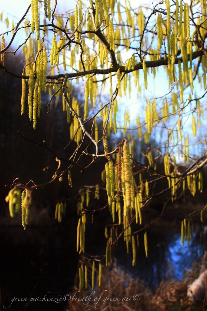 True treasures of nature, these gold filled catkins will yield crops of sweet nuts, when summer dares to a close on the other side of the year. For now they dress the hazel trees in splendid cloth of gold, as regal as anything woven by man on a loom. Their brightness against the clear winter sky, a welcome surprise, transforming this secluded pool into a wonder of the woods. I can see the lingering breath of the delighted wood spirit who splashed this yellow paint with wild abandon and a wide smile. It’s contagious and I can almost believe that summer has arrived, until a chill wind bites me through my thick coat and woollen hat. Winter lives on but these golden treasures hold the promise of warmth, as they have for millions of years. Our ancestors were teased and inspired by the same golden tassels of the wild hazel woods in winter, and would return for the sacred nuts of wisdom when the seasons turned.