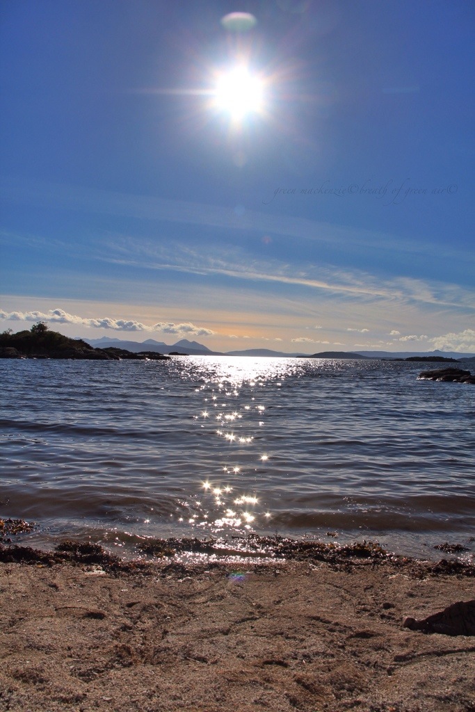It was the end of another beautiful Scottish day, and the waves lapped lazily in soft sights onto the beach. They could hardly summon the energy to move even the tiny white shells which lay in drifts across the pale sand. The air was perfectly still and clear, carrying the sounds of a distant cuckoo and the warm buzz of nectar drunk bees. As the sun began to soften and relax into the west, the restless waves carried golden sun stars across the Inner Sound, all the way to our waiting feet.