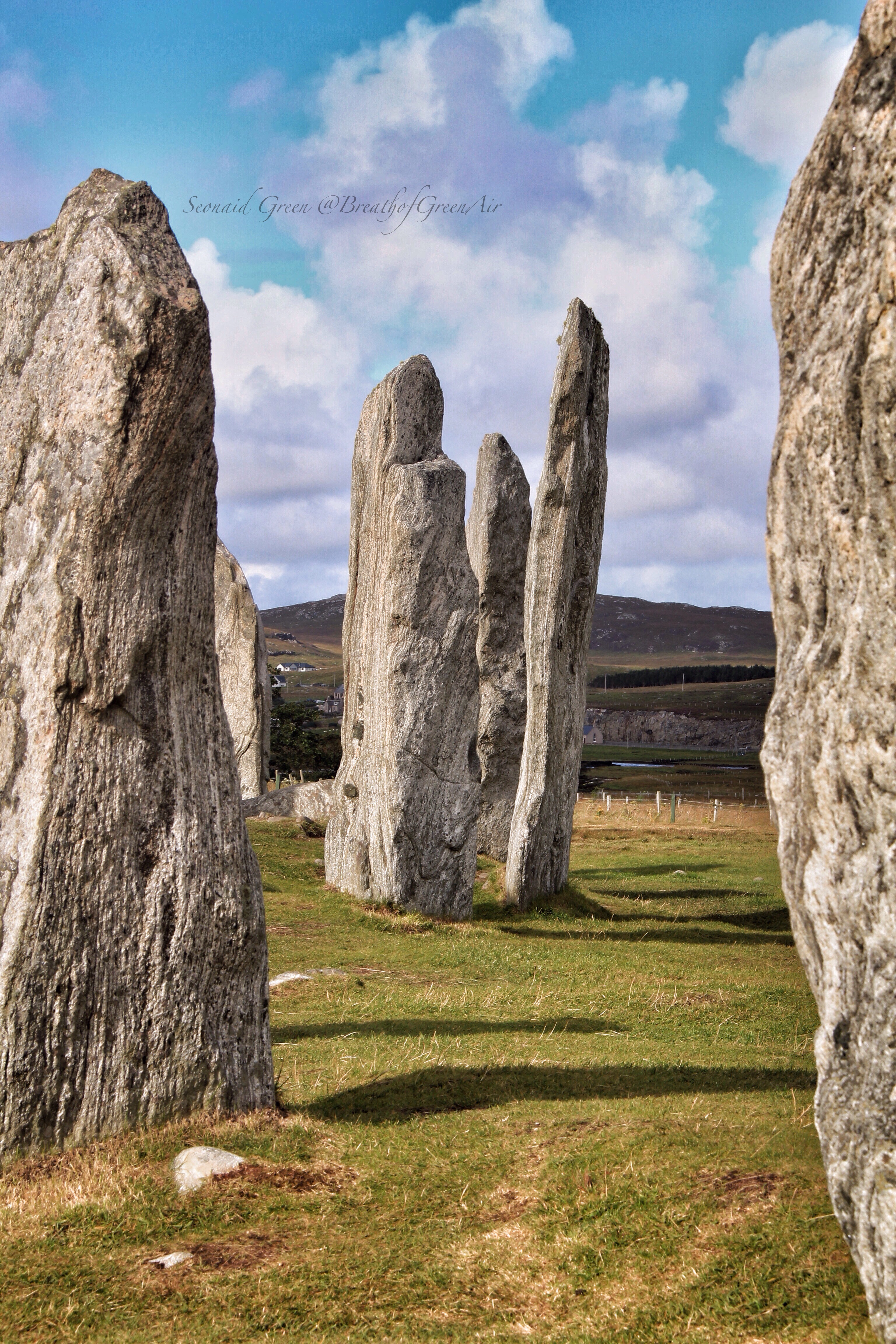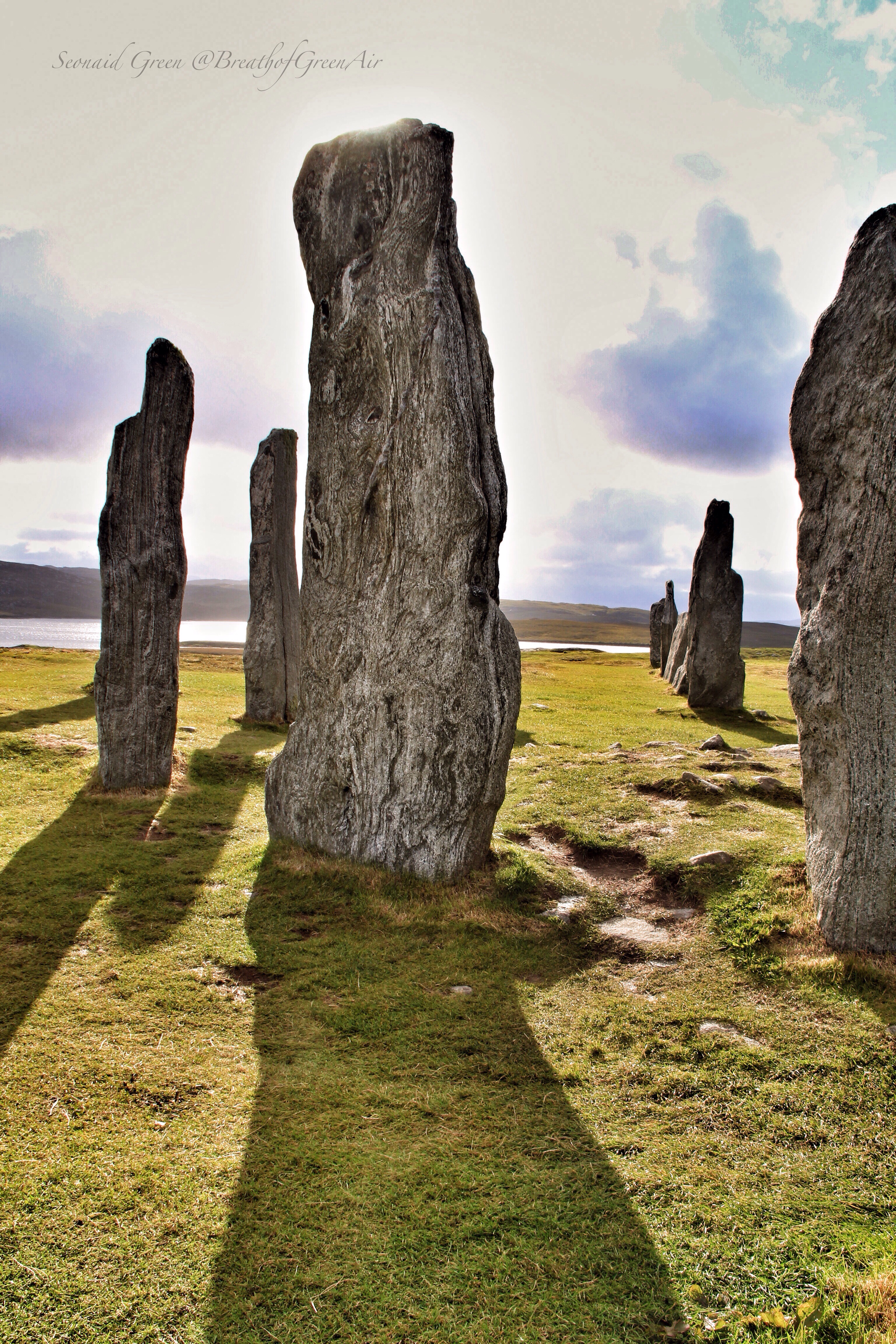 The modern Gaelic name of Calanais was originally Callernish and even earlier Classerniss, and it stands as one of the most complete stone circles in Europe. The tales and myths which swirl around the circle take on many shapes, and in the 17th century local islanders knew the stones as fir bhreige, or false men, and it is said that the stones were men enchanted by a sorcerer. They do indeed seem to cluster together as though they were people sharing secrets, and each one has its own face and character. Other tales from around the Isles speak of standing stones as pot stands for the cauldrons of the mountain Giants, the Feinian, who ruled here before men, while others say the stones themselves are petrified giants who refused conversion to Christianity. The ancient Greeks called the isle Hyperborea,  and claimed that it was the birthplace of Apollos mother Leto. The more local Celtic deity Mac nOg, (an Apollo of the north), was the son of Bu-vinda the White Cow, and a local tale speaks of a Gaelic speaking white cow emerging from the sea during a time of famine. She gave a bucket of milk to anyone who visited her at the stone circle. Local legend states that at the summer solstice The Shining One still descends and walks along the stone avenue at dawn to the song of a cuckoo, blessing all who witness this.