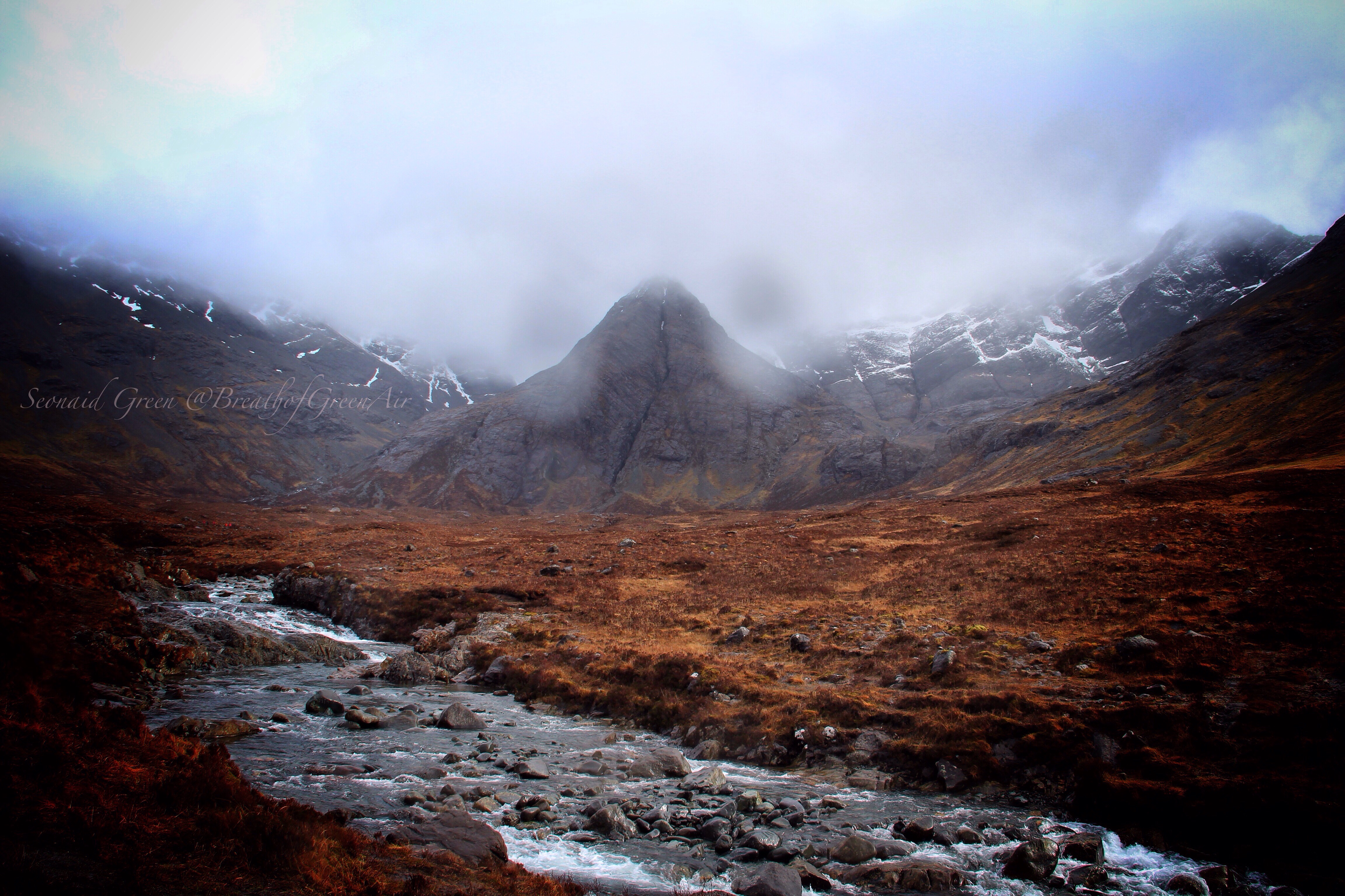 Further up Glen Brittle, the clouds and mist won the day against the sun, and swept in around the curved bowl of Coire ne Creiche. Sitting with a soft cloud blanket around his shoulders, Sgurr an Fheadain, sits proudly guarding the Glen of the famous Fairy Pools of Skye.